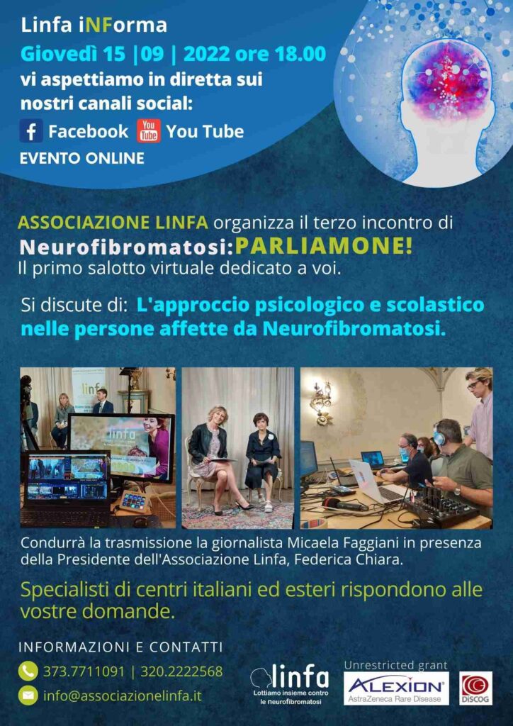 Con la puntata del 15 settembre 2022 a partire dalle ore 18 dall’Hotel Ritz di Abano Terme ( in diretta su Fb https://www.facebook.com/LinfaNEUROFIBROMATOSI e su youtube https://www.youtube.com/user/AssociazioneLinfaNF/featured ), proseguono le trasmissioni organizzate dal’Associazione Linfa dedicate all’informazione sulle neurofibromatosi.