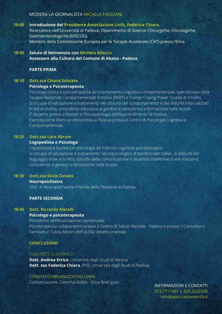 “Con queste puntata ma in realtà con l’attività quotidiana dell’associazione puntiamo al benessere del paziente e della famiglia e non solo al controllo dei sintomi della malattia” dichiara la Presidente dell’associazione Linfa Federica Chiara , già ricercatrice dell’Università degli Studi di Padova, Dipartimento di Scienze Chirurgiche, Oncologiche e Gastroenterologiche (DISCOG) e dal 1 luglio nominata membro della Commissione Europea per le Terapie accelerate (CAT) presso l’Ema.